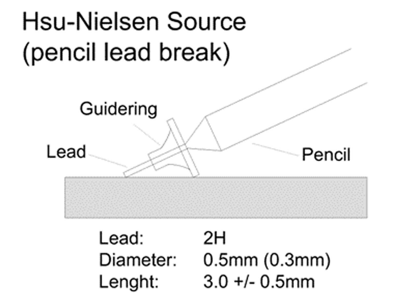 Device (named after developer of the technique) is an aid to simulate an acoustic emission event using the fracture of a brittle graphite lead in a suitable fitting. This test consists of breaking a 0.5 mm (alternativley 0.3mm) diameter pencil lead approximately 3 mm (+/- 0.5 mm) from its tip by pressing it against the surface of the piece. This generates an intense acoustic signal, quite similar to a natural AE source, that the sensors detect as a strong burst. The purpose of this test is twofold. First, it ensures that the transducers are in good acoustic contact with the part being monitored. Generally, the lead breaks should register amplitudes of at least 80 dB for a reference voltage of 1 mV and a total system gain of 80 dB. Second, it checks the accuracy of the source location setup. This last purpose involves indirectly determining the actual value of the acoustic wave speed for the object being monitored.